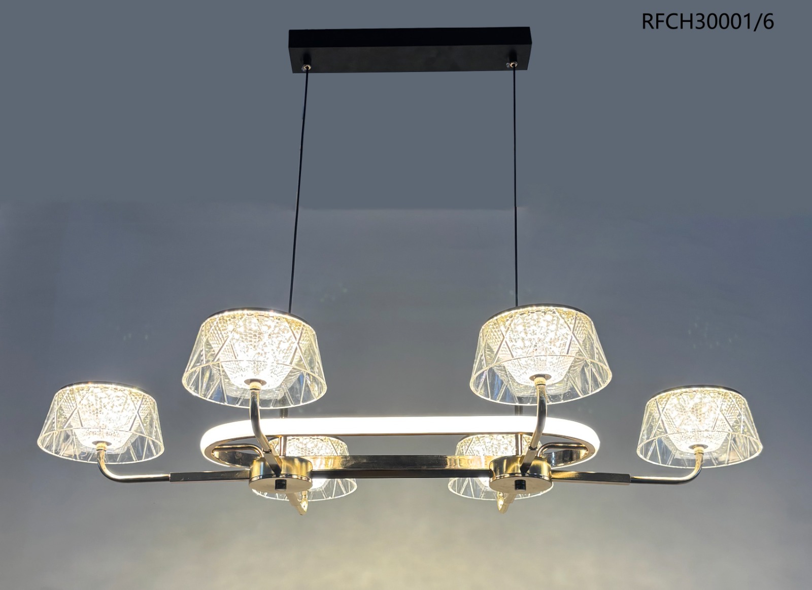 Experience elegance in motion with the RFCH30001/6 Modern Linear Crystal LED Chandelier — a perfect fusion of sophistication and contemporary design. This six-light fixture features crystal-patterned glass shades that emit a dazzling glow, suspended over a sleek gold and black frame. The integrated LED strip along the center adds ambient illumination, making it ideal for both dining and living spaces.