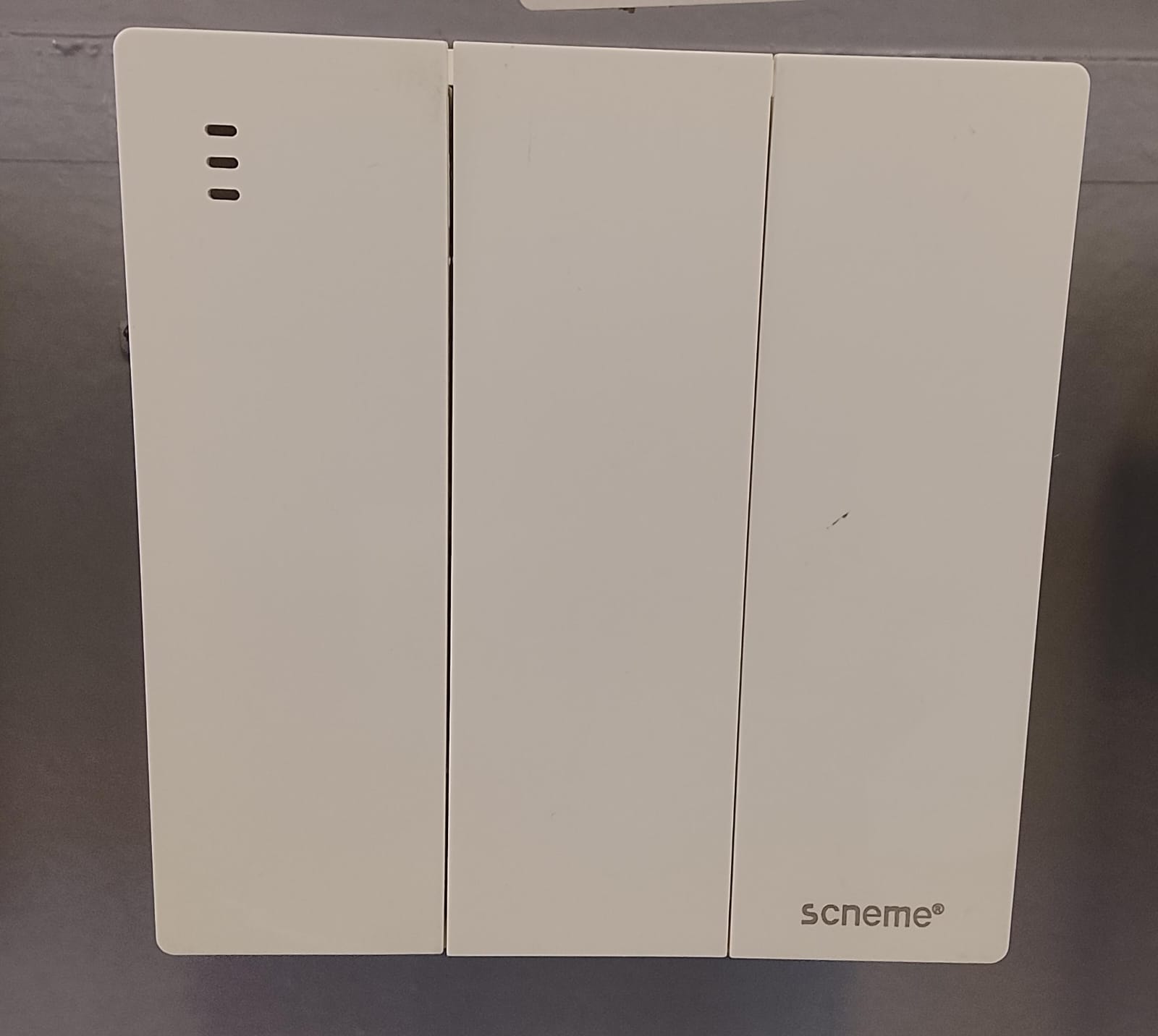 This is a three-gang wall-mounted rocker switch from the Scneme brand, designed to control three separate electrical circuits (for example, multiple lighting zones, fans, or appliances) from a single location.